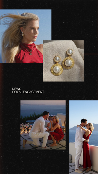 A romantic cliff top proposal in Santorini, amongst roses and candles. Lady Eliza looked radiant in a scarlet silk dress and our 'No Grit, No Pearl' Earrings.